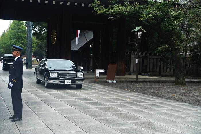 天皇の勅使を乗せた車で、その車は神門の石段をゆっくりと通過する。