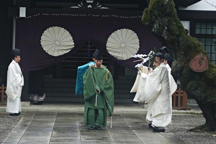 10時30分になり、神官に続き天皇の勅使が社務所から出て来た。
