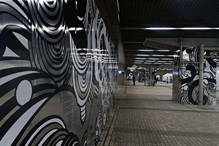 「このたび、訪れる方々に楽しい西新宿を体験して頂くため、道路や公開空間とを活用したイベントで、人が憩い、楽しく歩ける街を体験できる3日間が始まります」とあった。最初に見た都庁第一庁舎の1階広場の大量のモノクロのデザインに圧倒された。