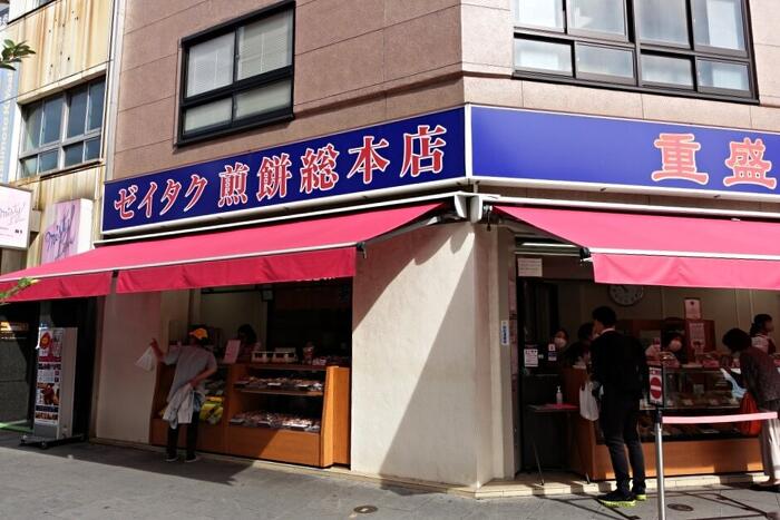 交差点の右側角はゼイタク煎餅と、人形焼きの「重盛永信堂」である。