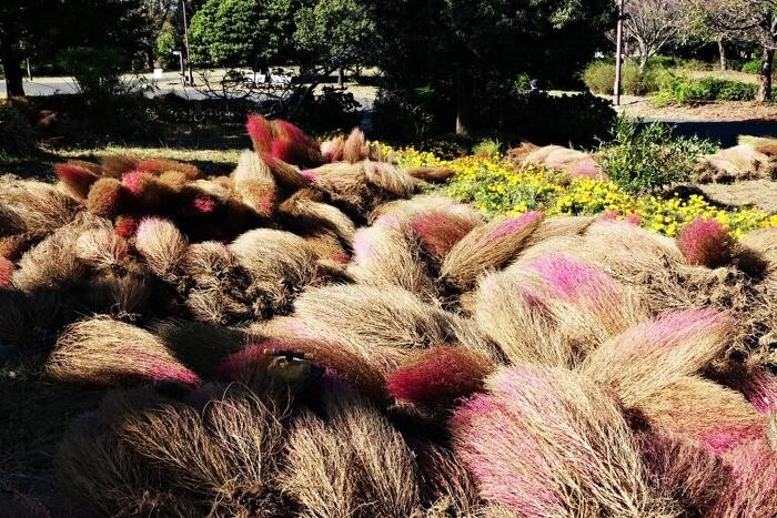 広い公園のどこに「コキア」があるのか分からない。一番端まで行ったが、見当たらない。公園の反対側を探して歩いたら、公園の一角に囲まれた花壇が見えた。