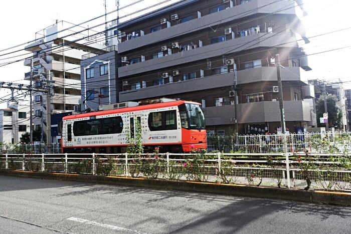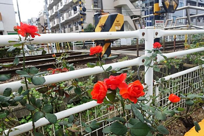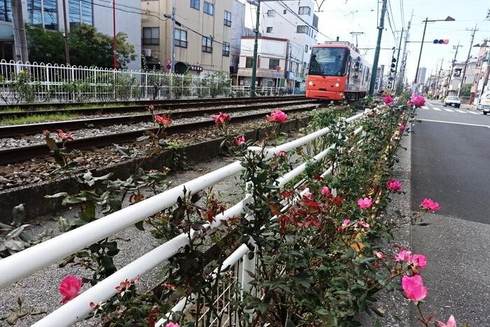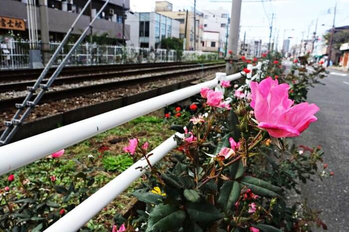 その先に8駅進むと、荒川線で一番バラの多く咲いている「荒川車庫前」になるので、ここで降りる。終点の三ノ輪橋までの間は、線路の両側にバラが見られる。