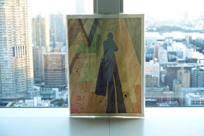 彼はアーティストでもあるので、以前に私が送った私の影絵を水彩画にして持って来てくれた。