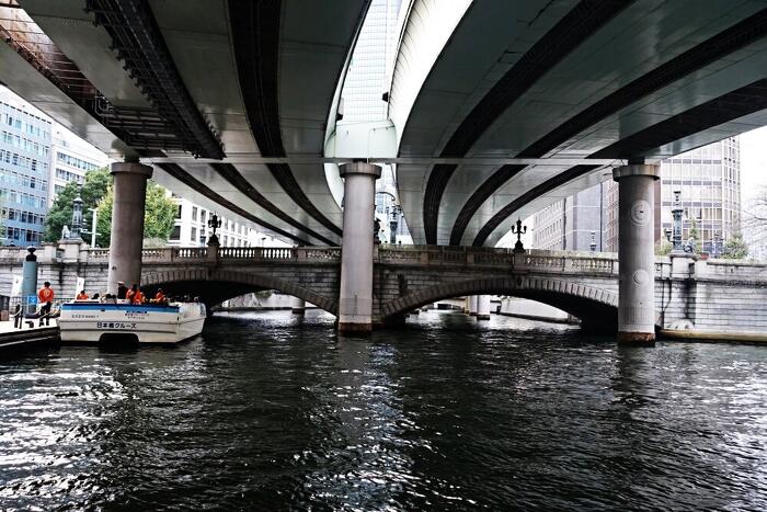 日本橋の船着場を出た船は上流に向かい、日本橋の下を通過して日本銀行の先でUターンした。