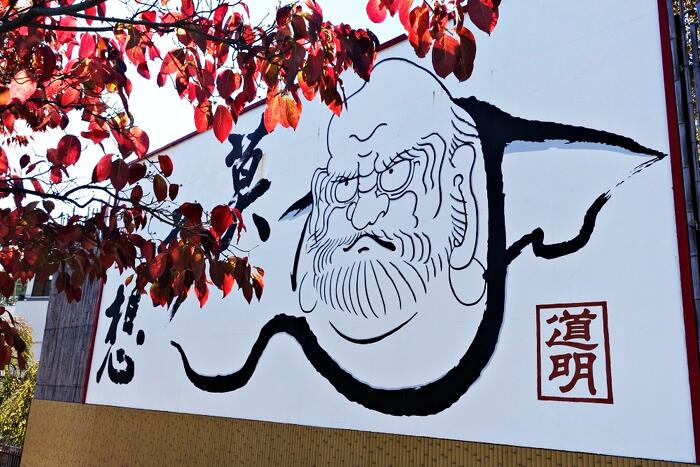 成願寺の前を通ると、竹の塀の上に巨大な達磨のイラストが描かれているのが見える。