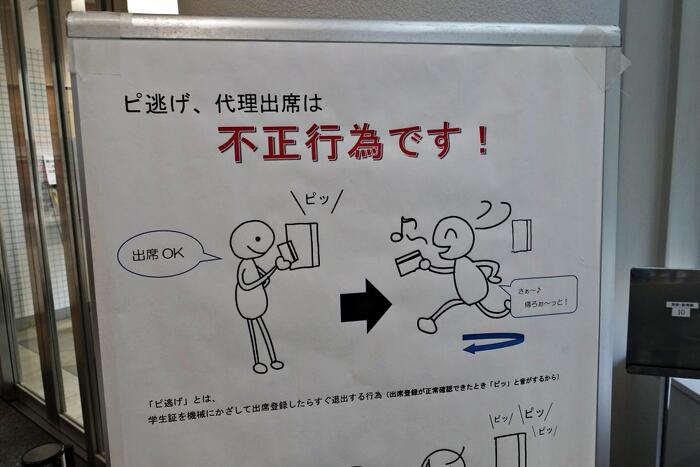 「ピ逃げとは学生証を機械にかざして出席を登録したら、すぐに退出する行為。出席登録が正常に確認できたときピッと音がするから』と書いてあった。