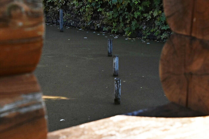 しかし水面を見て驚いた。一面に茶色の藻が覆い尽くしていて、水面が全く見えない。