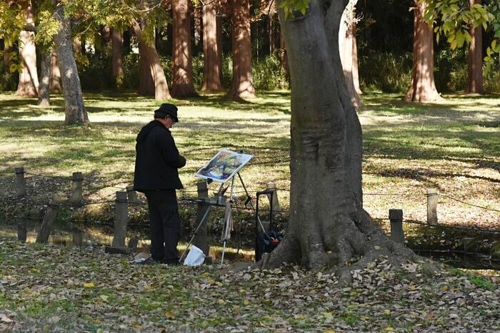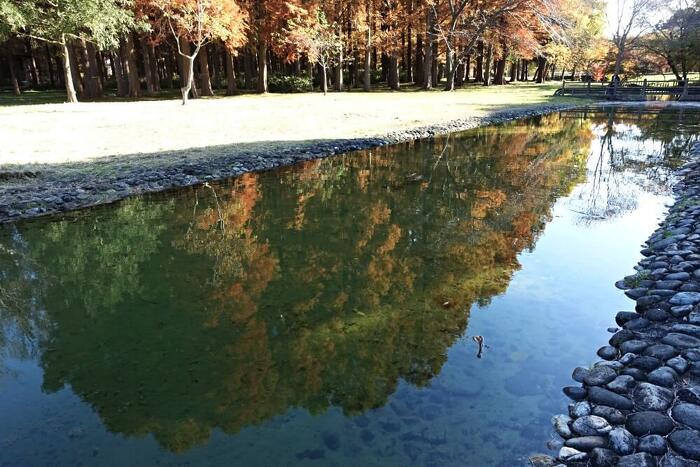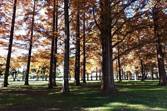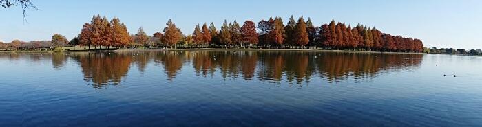 公園に入ると目の前が開けて、対岸のメタセコイアが目に入る。