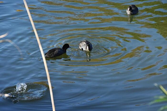 右手の水路に「オオバン」の群れがいて、急に潜っては小魚を捕まえて来る。