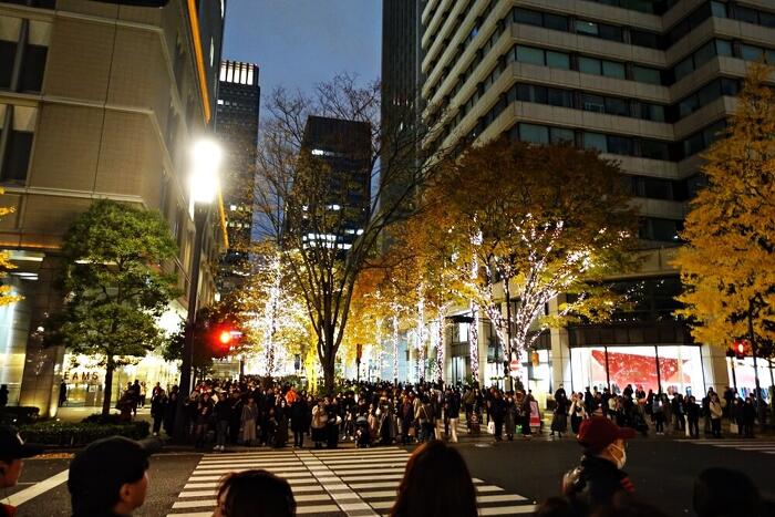 混み合う仲通りも有楽町駅前からの道路と交差すると、イルミネーションも終りでガラ空きとなった。