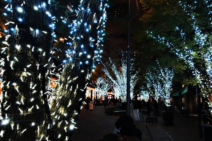 丸の内仲通りのイルミネーションはオレンジ色だったが、日比谷はブルーである。