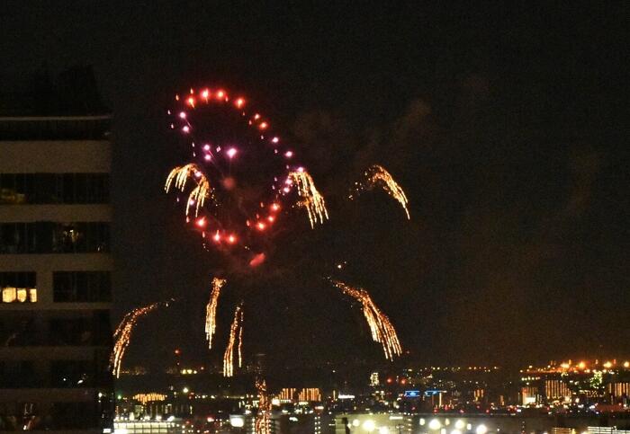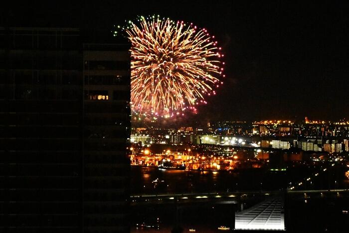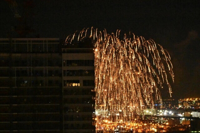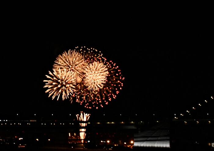 前回撮影したマンションのスカイラウンジの距離からは、半分くらい花火に近付いた。