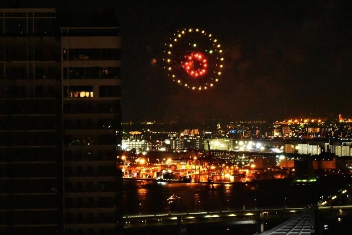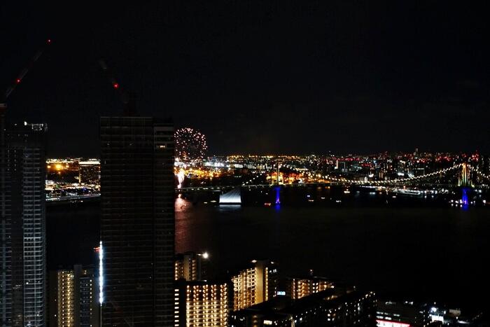 ここからお台場は遠いがスカイラウンジからは遮るものが無いので、レインボーブリッジの向こう側に花火が見えるはずである。