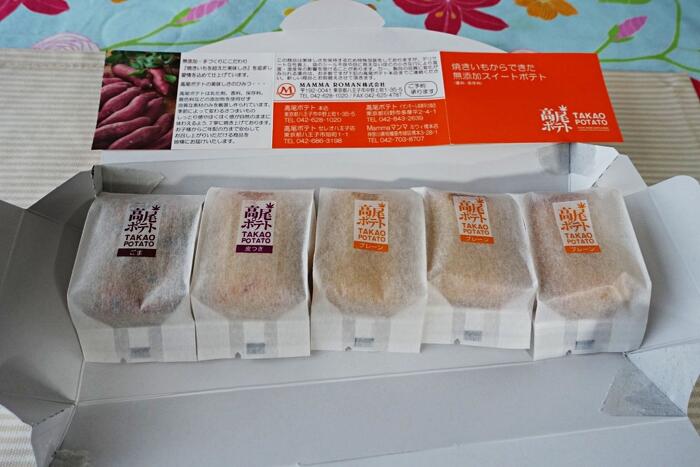 「グランプリ」と言っても東京都ではなく八王子市限定だし、「サツマイモ菓子だからなー」と思っていた。細長い箱を開けたら、紙に包まれた「高尾ポテト」が5個入っていた。