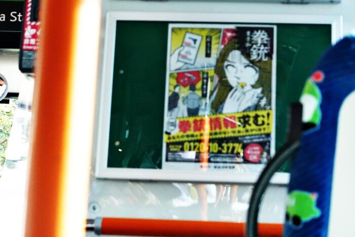 都バスの運転席の後ろに、大きなポスターが貼ってあり「拳銃」という文字が見えた。