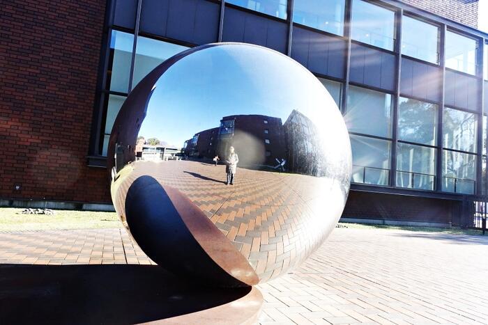 入口の前には巨大なスチール製の鏡の球体がある。これは築地の「はとば公園」にあるものと同じだ。「はとば公園」の作品名は「my sky hole 92-6 水の情景」で、作者は「井上武吉」である。