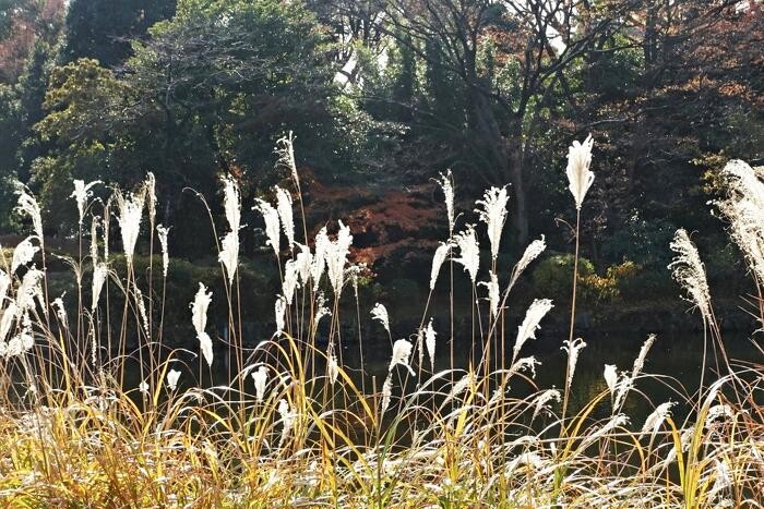 池の淵に植えられたススキが、光を浴びて光り輝いていた。