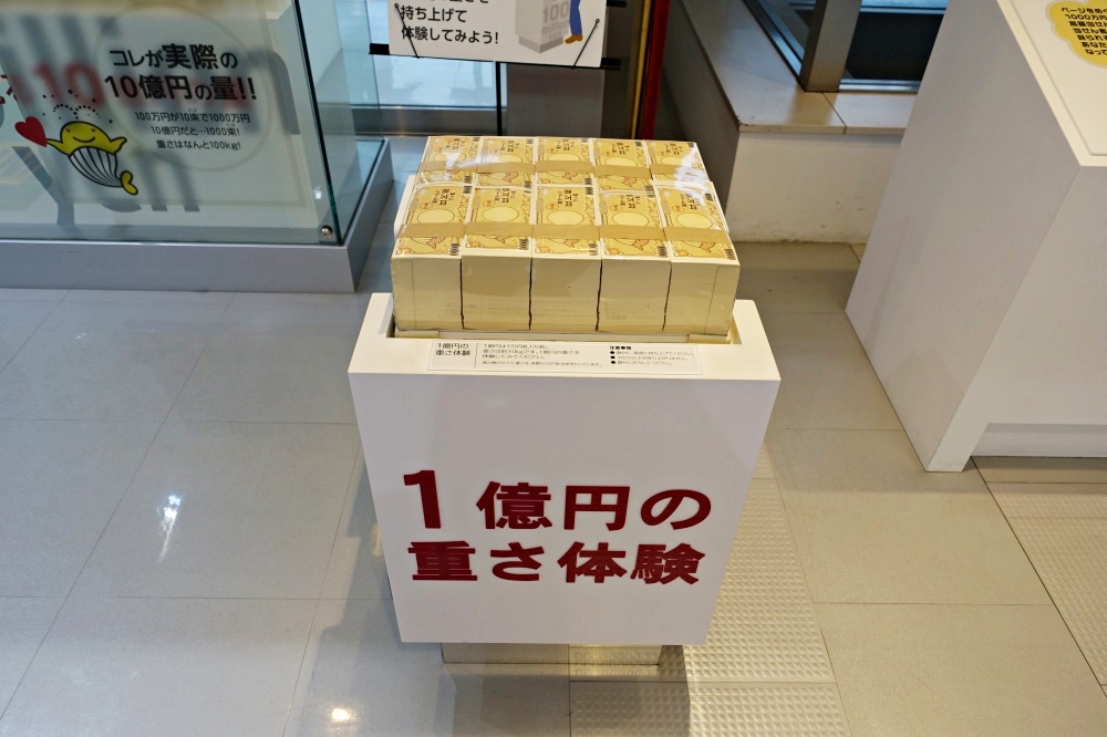 館内の中央に大きな「クーちゃん」が置いてあり、『写真を撮ってSNSで拡散してね』と立札がある。また模型の「1億円」が置いてあり、「1億円の重さ体験」が出来るようになっている。1億円の札束の重さは、なんと「10キロ」もあるのだ。