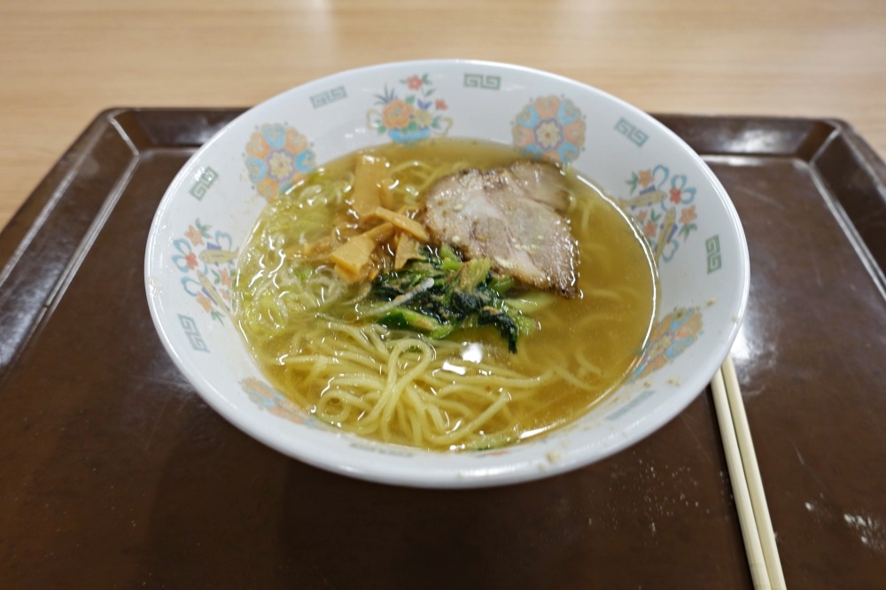 券売機の前で「なにを食べようか?」と迷ったが、後ろに学生が並んだので「塩ラーメン」(350円)のボタンを押した。食券を持って麺類コーナーに行くと、すぐに塩ラーメンが出て来た。席に座り塩ラーメンを食べたが、とても美味しかった。