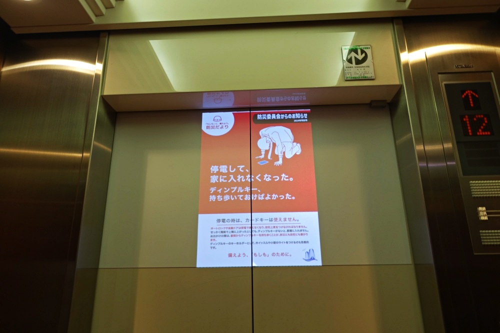 これは「デジタル・サイネージ」という広告だそうだが、管理組合が試験的に導入したようだ。エレベーターの奥の上方にある映写機から、ドアの上方に広告やお知らせを映し出す。