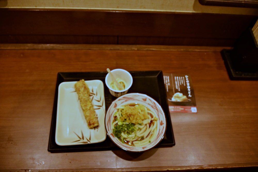 やっと自分の番が来て「ぶっかけうどん(冷)」とちくわ天を注文したら、小さなカップにいれた「一口醤油うどん」も渡された。 並んでいる時に厨房を見たら、「うどん」はいつもと同じものだった。ただ醤油をかけて食べるだけのことだった。