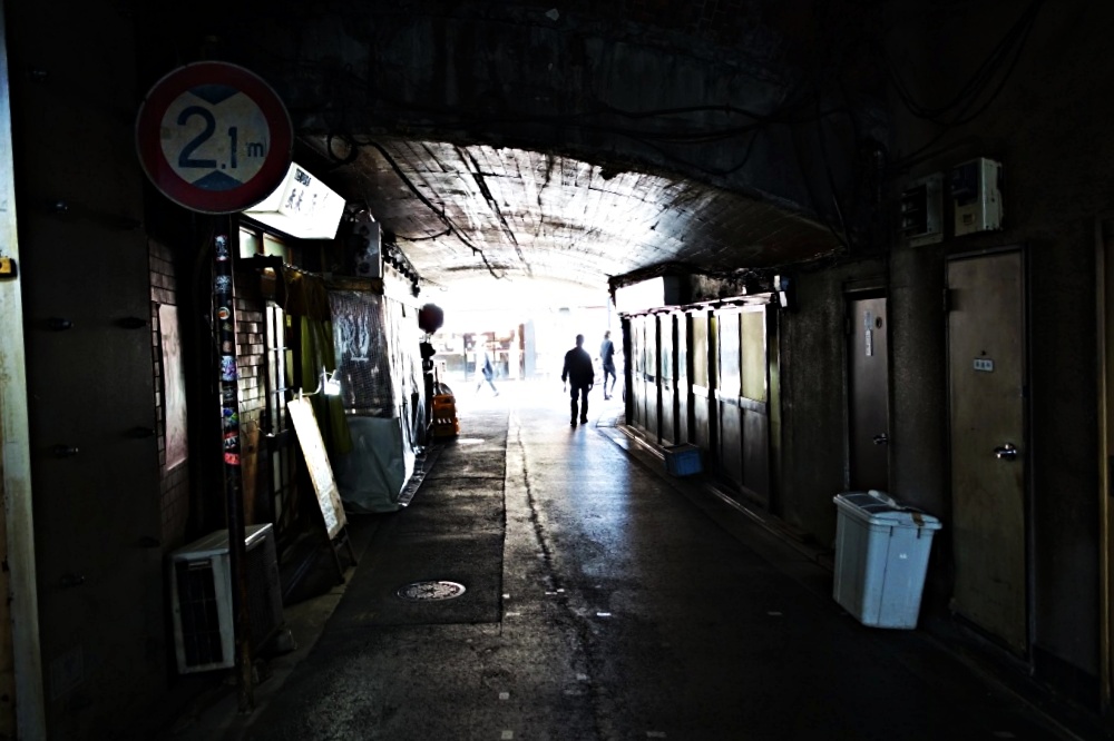 突き当りを右に曲がるとJRの下を潜る暗いトンネルがあり、ここを抜けると中央区から千代田区になる。