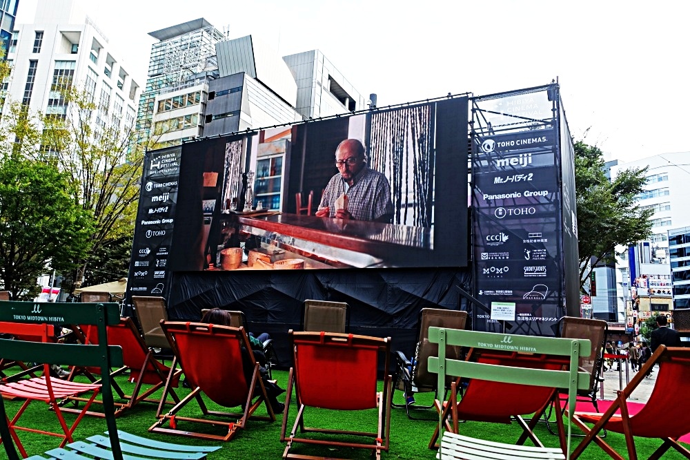 この日は「第38回東京国際映画祭」を開催中で、大きな画面に映画を映し出している。