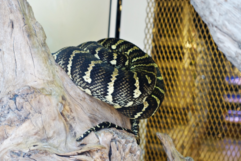 表から見えるガラスケースの中に、白黒の縞模様の蛇が木に絡まって寝ていた。