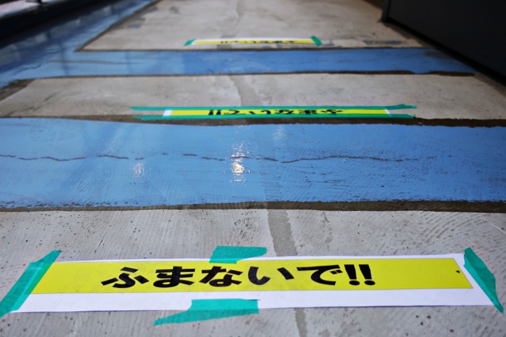 それが2~3日前から、その一部になにか分からないが青色の塗料のようなものが塗られた。そして「ふまないで!!」と床に張り紙が置いてある。