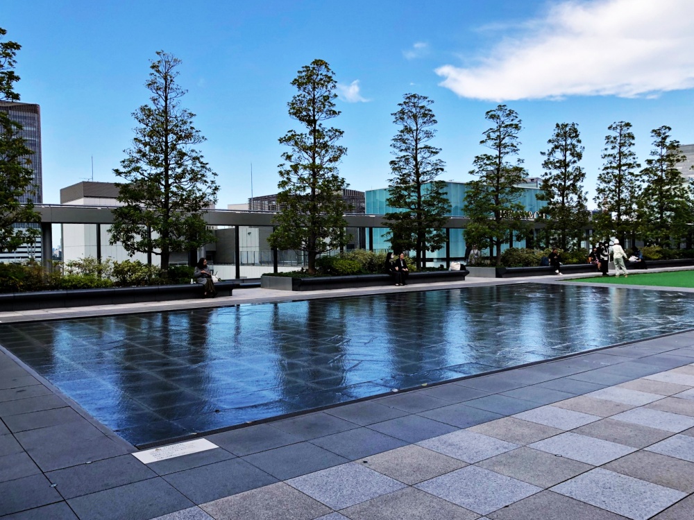 外の広い通路を4台の自動走行モビリティ「iino」が人の歩く速度で動いている。私は面白そうなので乗ってみた。立ったままの3人乗りのモビリティで、木製の手摺を掴むと動き出す。止まりたい時には「STOP」マークを押せばすぐに止まる。