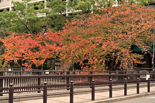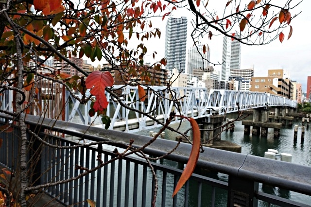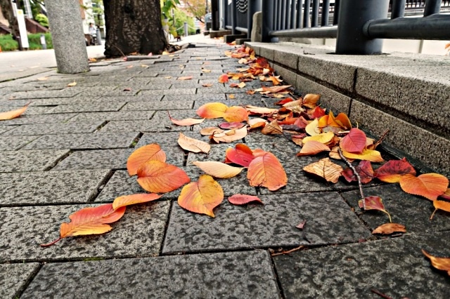 図書館の帰りに晴海運河を渡り、トリトンスクエアでランチにしようと思っていたのである。その時に晴海運河の「「晴月橋」の向こうに植えられた、ソメイヨシノの木が秋になり紅葉になっているのが見えた。橋を渡ったら、側道にたくさんの赤と黄色の葉っぱが落ちていた。なんとも風情のある光景なので、思わず写真に撮った。