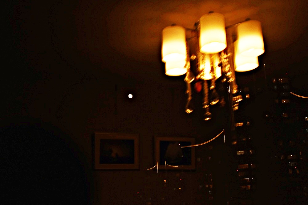 そのままそこから写真を撮ったら、天井のライトと壁に架けた2枚の写真がガラスに反射して映った写真になった。その向こうに隣のマンションの屋上の光と、その左に月が写っていた。なんだかアートぽい写真になり、私は満足している。