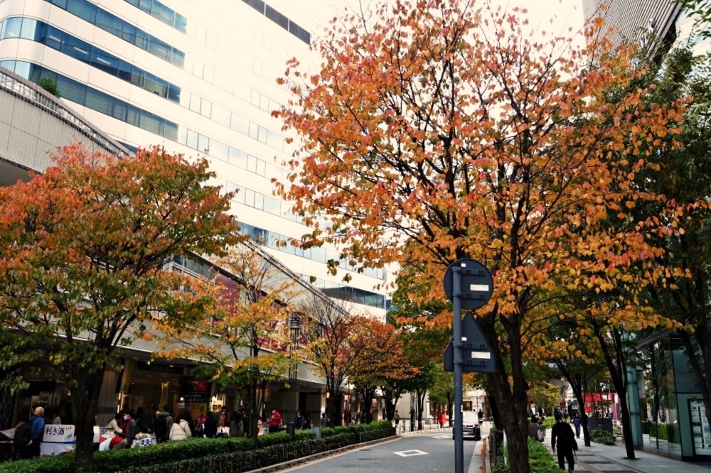 でも見付けられなかった。「銀座の柳」と言われるように柳通りはあるが、街路樹は多くが常緑樹である。足を延ばして有楽町駅に向かった。すると東京交通会館の横と前の通りに、目指す紅葉が見えた。