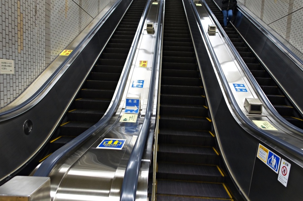 ここは乗降客が多いので時間帯によって、3本のエスカレーターの内の2本は同じ方向に動く。