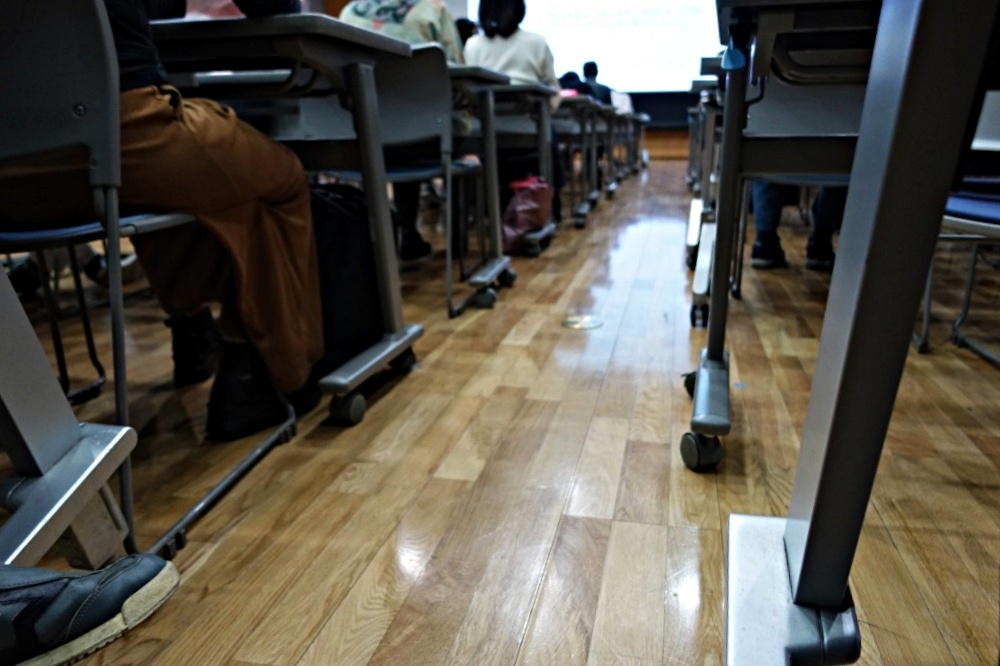 大きな教室で正面に巨大な液晶のモニターがあり、いつも50人以上の聴講生が来る。
