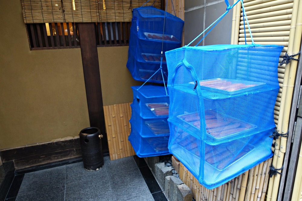 小料理屋の前に吊るされた「カラスミ」乾燥中:
