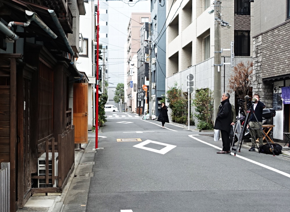1人が長屋を指さしてなにか言っている。あとの2人はビデオと音声の係だった。