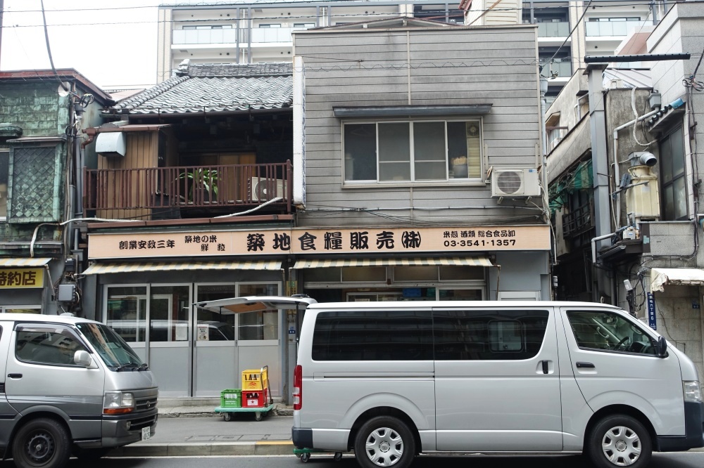 すると左側に「築地食糧販売㈱」という、なんとも時代錯誤のような店名の米屋がある。