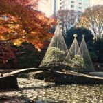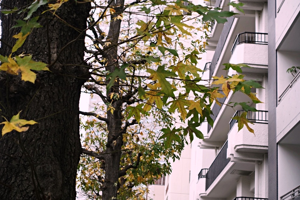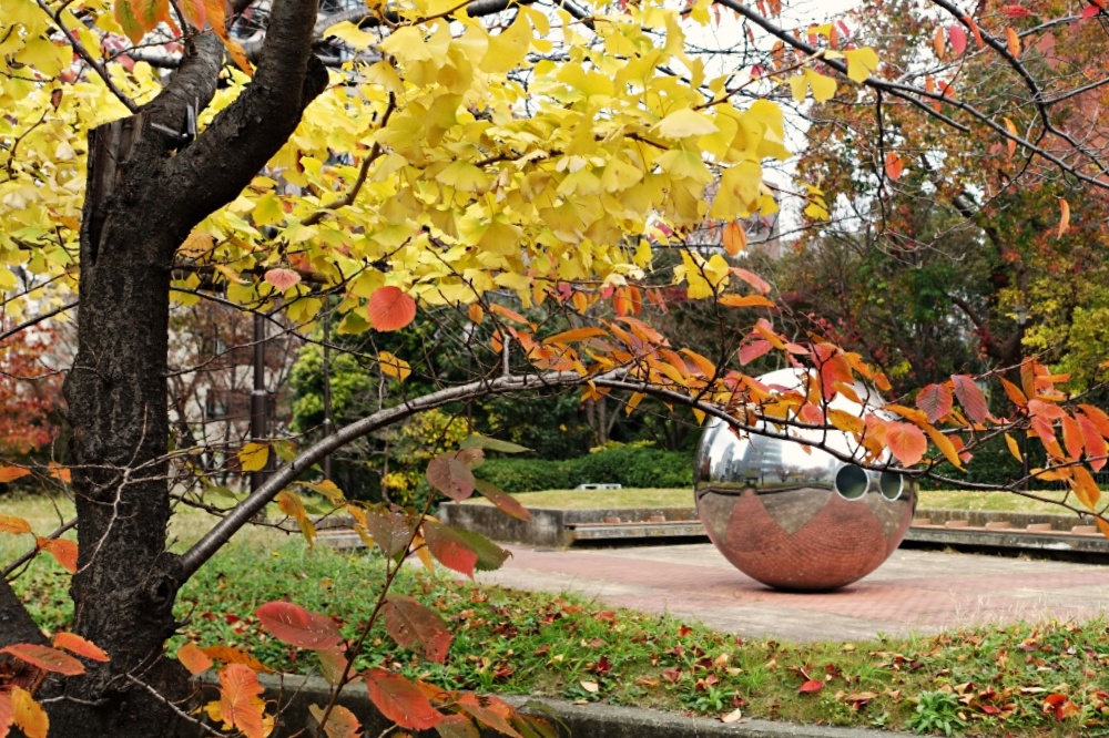 初冬のいまは桜の葉の紅葉と銀杏の葉の黄葉で、枝越しの球体「my sky hole」が美しく映える。球体の前に立つと、ビルや自分が歪んで映るのが面白い。