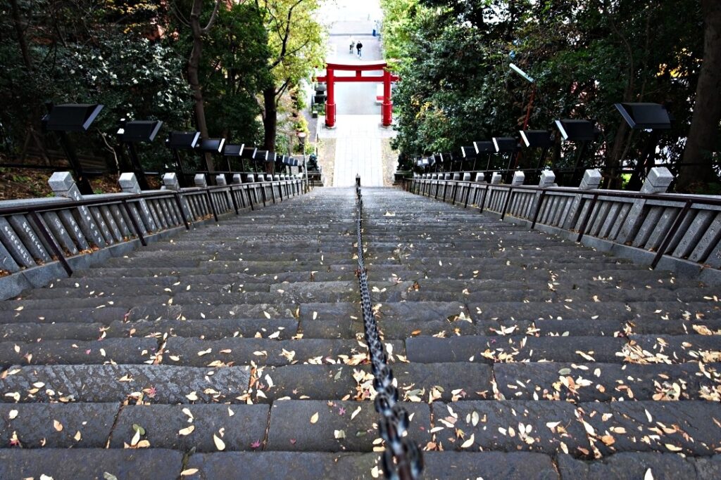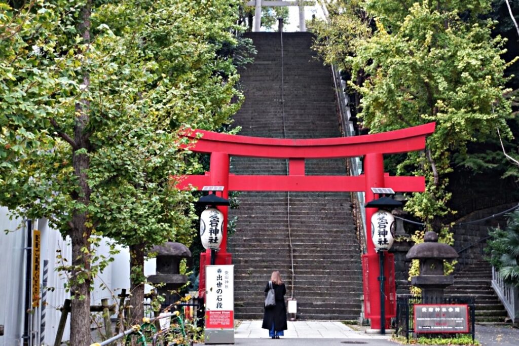 真っ赤な鳥居の下に立ち、出世の石段を見上げる。凄い急階段で、見ているだけで怖い。