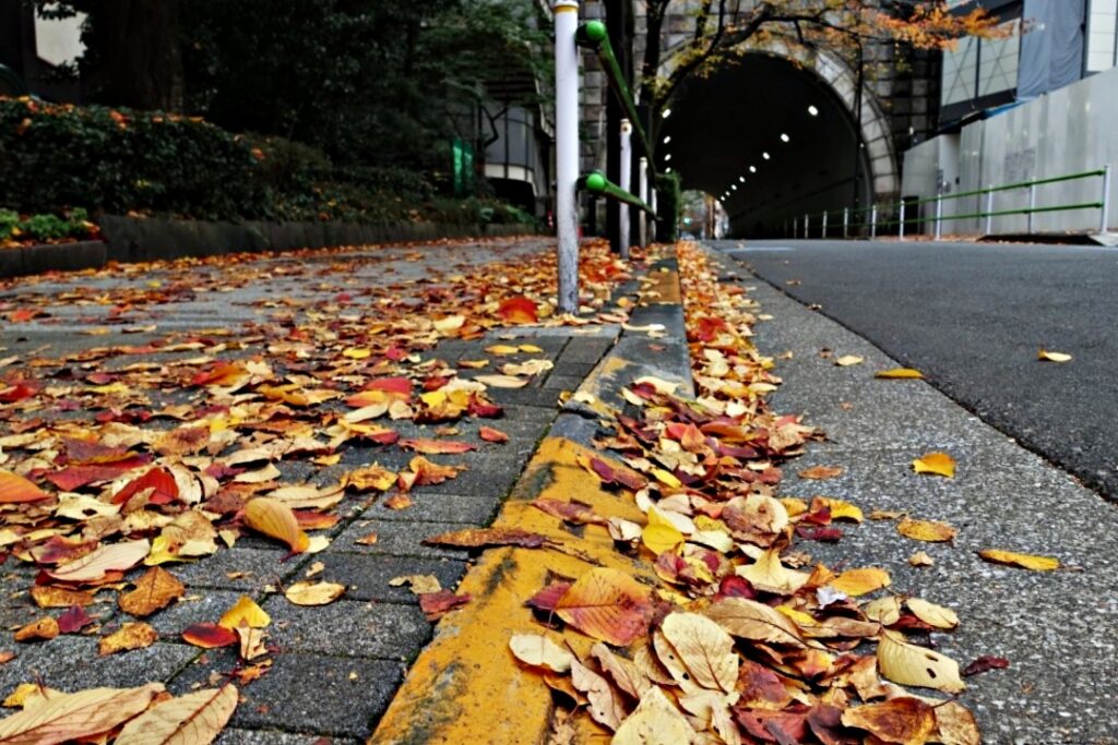 右横に急坂だが、コンクリートの道路がある。これは自動車用の道路であるが、歩くことも出来る。左に100メートルほど進むと右に曲がる道路があり、その先はトンネルになっている。紅葉した桜の落ち葉が歩道に落ち、紅葉の絨毯のようだ。