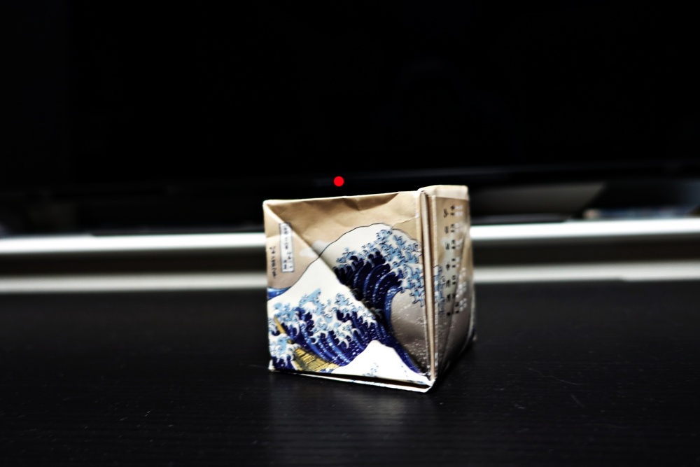 紙芝居は小さな絵で、北斎の書いた「塵劫記」という物語で、なんだかよく分からなかった。続いて折り紙が始まったが、四角の紙を折って、それを箱型にするイベントだった。