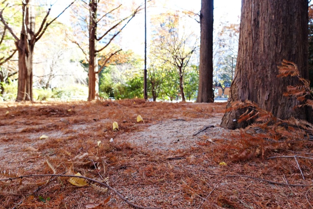 そろそろ築地の「あかつき公園」のメタセコイアの葉が落ちて、一面の茶色の絨毯が出来ている頃だと思って見に行った。この日は朝から強風が吹き、マンションを出たところでビル風で飛ばされそうになった。