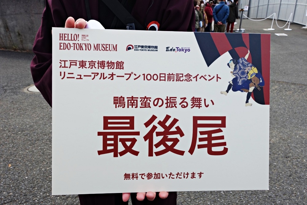 彼の持つ大きなプレートには「江戸東京博物館 リニューアルオープン100日前記念イベント 鴨南蛮の振る舞い 最後尾 無料で参加いただけます」と書いてあった。