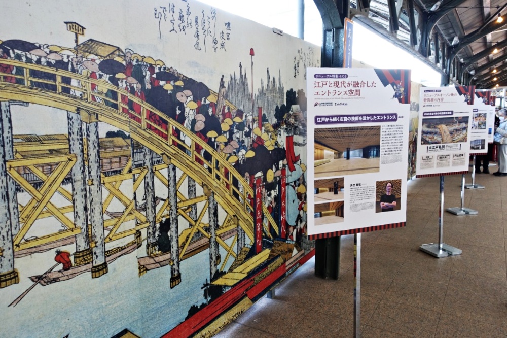 その手前には何枚ものパネルが立ててあり、リニューアル後の館内の様子を見せている。ホームの端には「江戸」に関するクイズが絵と共にあり、答えは紙をめくると分かるようになっていた。向い側は一段高くなっていて、総武線のホームなので乗客が電車を待っているのが見える。