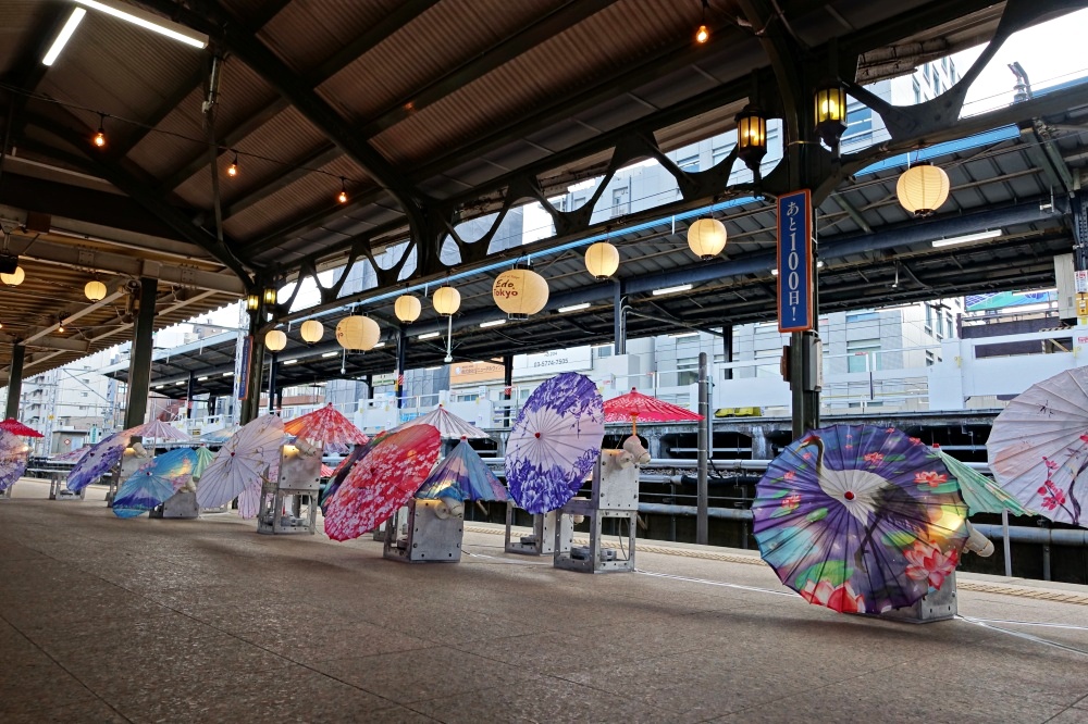 3番ホームを先に進むと、和傘が並んでいる場所に出る。