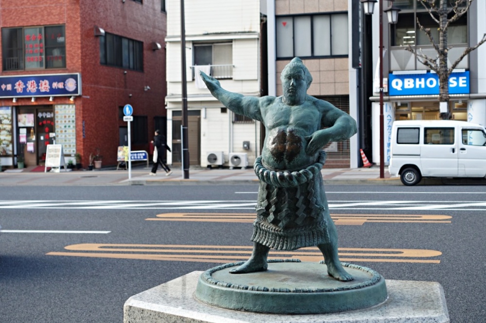 両国駅の改札口を出て左の回向院方向へ進むと、道路の両側に大相撲の横綱の銅像が立っている。力士像は東側に4体、西側に3体の計7体あり、不知火型のせり上がり、雲竜型のせり上がり、四股前、柏手を打つ前など、夫々異なり両国らしさを感じさせてくれる。