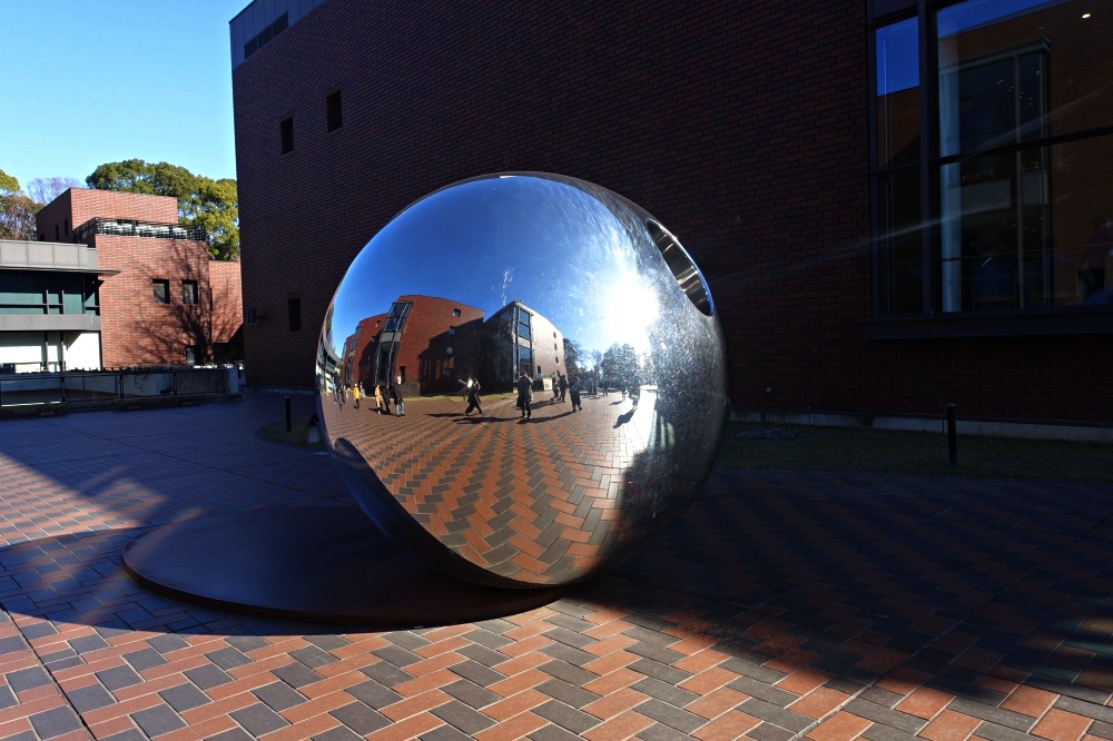 館内に入る下りのエスカレーターの手前に、巨大なメッキの球体が置かれている。