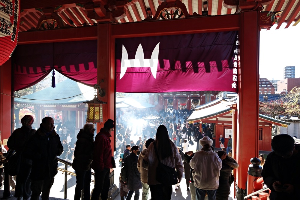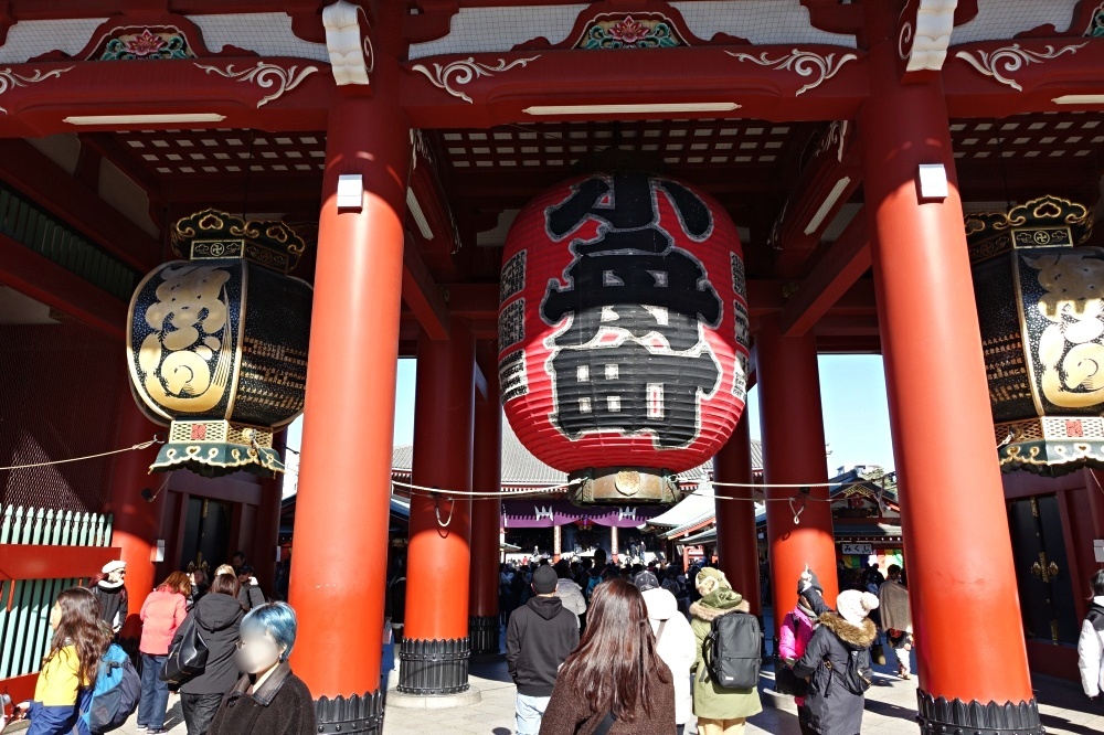 入口の「雷門」の大提灯の下では、記念写真を撮る人で大混雑である。
