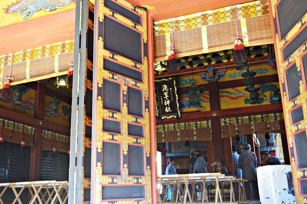 『浅草神社の神前で浅草寺の僧侶が読経をし、祭礼もともに行われていた。この社殿は1649年に三代将軍徳川家光が寄進し、本堂も同時に建てられた。本堂は火災で焼失したが、神社は大火を逃れ当時の姿を残している』。